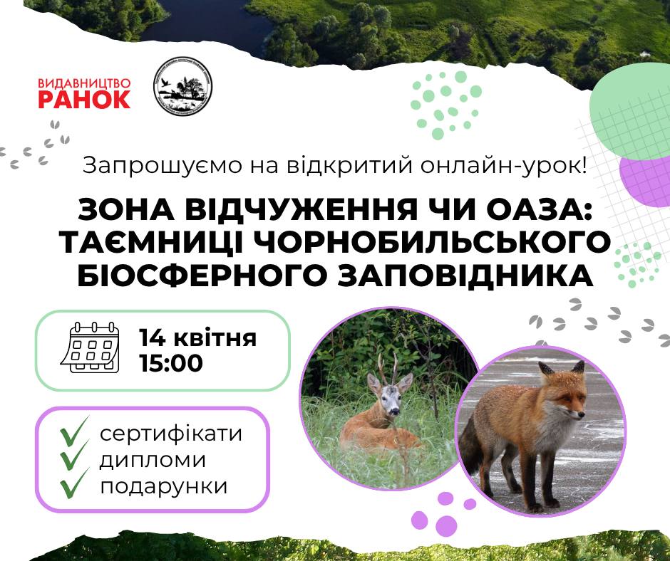 З нагоди 40-річчя Чорнобильська катастрофа видавництво видавництво «Ранок» спільно з Чорнобильським біосферним заповідником запрошують педагогічних працівників, батьків та учнів до участі у відкритому онлайн-уроці: «Зона відчуження чи оаза: таємниці Чорнобильського біосферного заповідника». 📅 Дата проведення: 14 квітня 2026 року.🕒 Час: 15:00.💻 Формат: онлайн. У програмі заходу: ознайомлення з історією створення…
